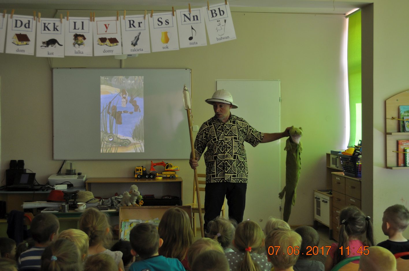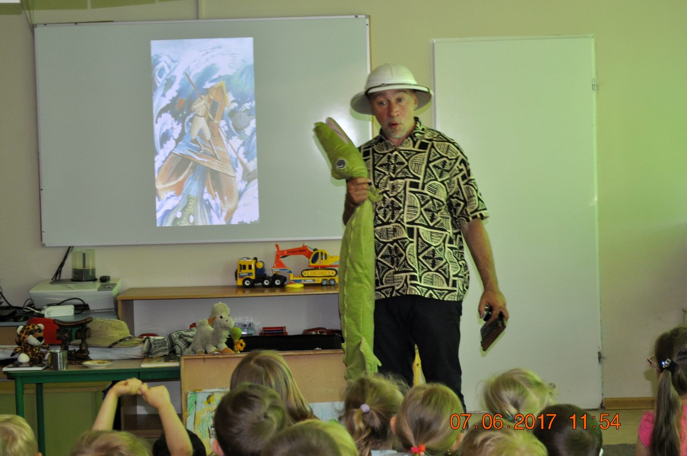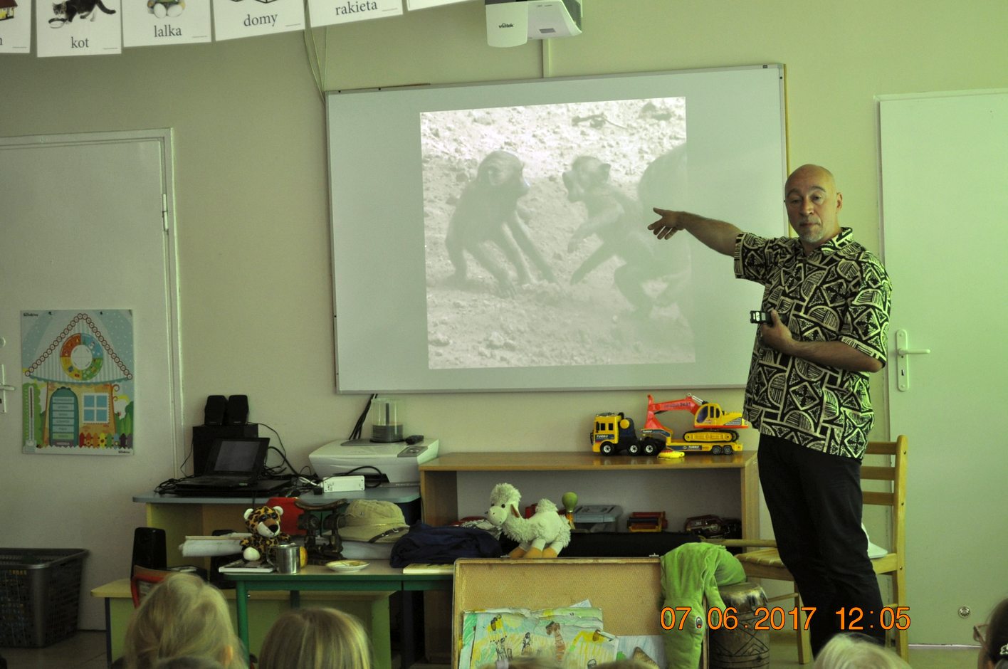 Autor przedstawił prezentacje multimedialną, dzięki której dzieci mogły zobaczyć i usłyszeć dźwięki jakie wydają i jak się zachowują afrykańskie zwierzęta. Następnie autor opowiadał dzieciom jakie spotkały go niebezpieczne przygody, spotkania z egzotyczną przyrodą i mieszkańcami. Każdy uczestnik spotkania miał okazję przymierzyć afrykański turban, zagrać na prawdziwym afrykańskim bębnie oraz położyć się na poduszce zrobionej z drewna.