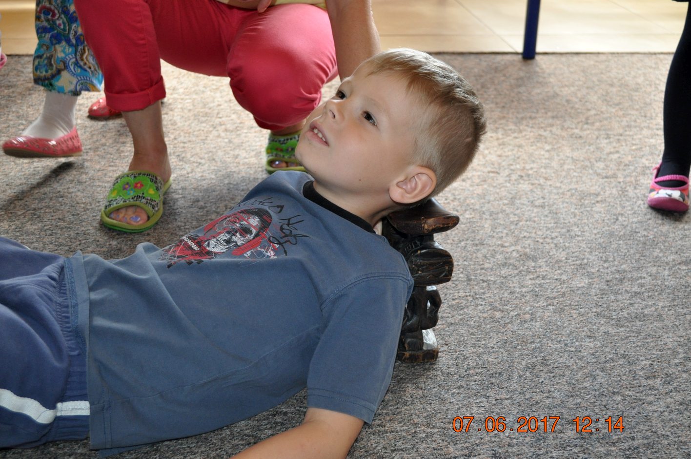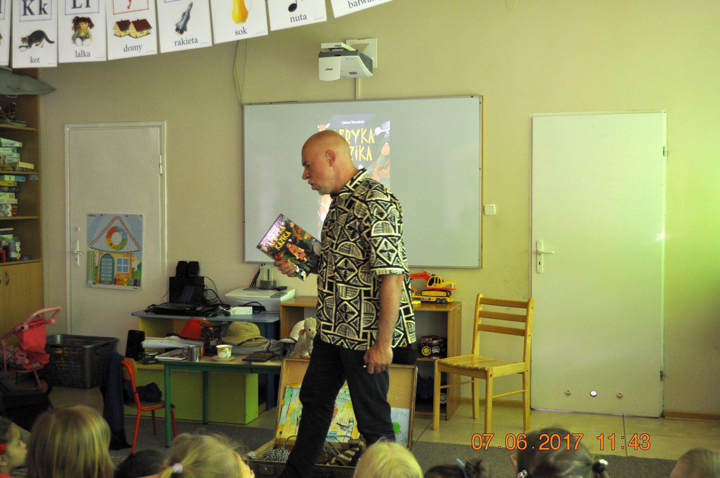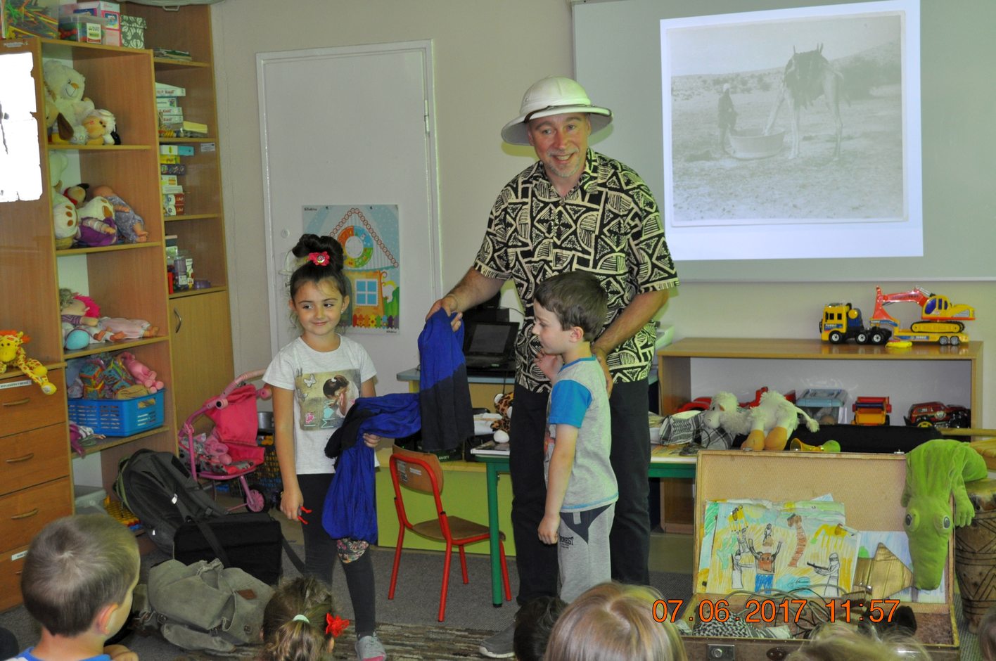 Autor przedstawił prezentacje multimedialną, dzięki której dzieci mogły zobaczyć i usłyszeć dźwięki jakie wydają i jak się zachowują afrykańskie zwierzęta. Następnie autor opowiadał dzieciom jakie spotkały go niebezpieczne przygody, spotkania z egzotyczną przyrodą i mieszkańcami. Każdy uczestnik spotkania miał okazję przymierzyć afrykański turban, zagrać na prawdziwym afrykańskim bębnie oraz położyć się na poduszce zrobionej z drewna.
