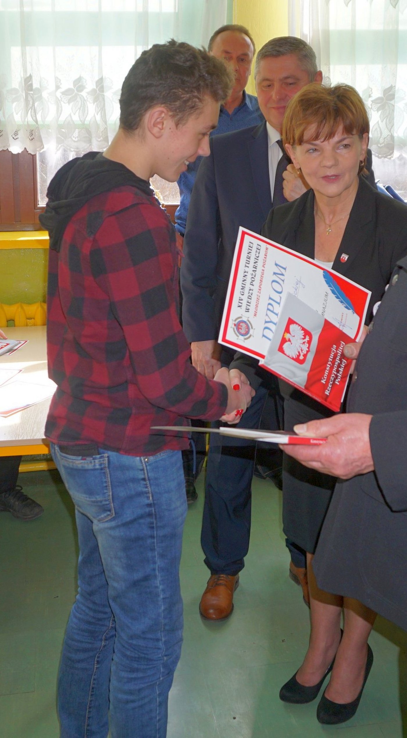 Wszyscy uczestnicy konkursu otrzymali dyplomy i nagrody książkowe. Wszystkim uczniom serdecznie gratulujemy a zwycięzcom swoich kategorii, tj. Bartoszowi Czupryńskiemu i Patrycji Szurgot życzymy powodzenia na eliminacjach powiatowych turnieju.