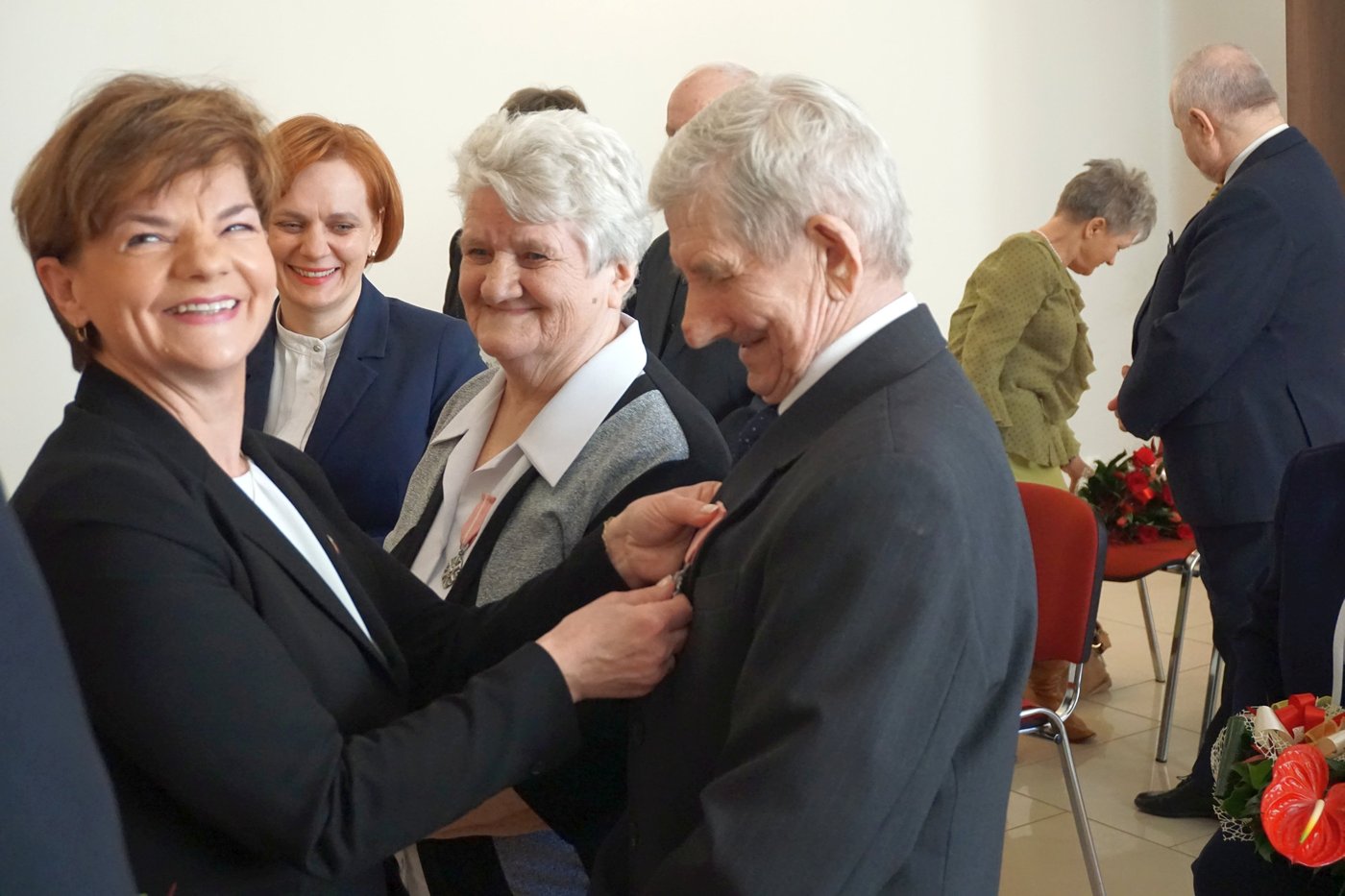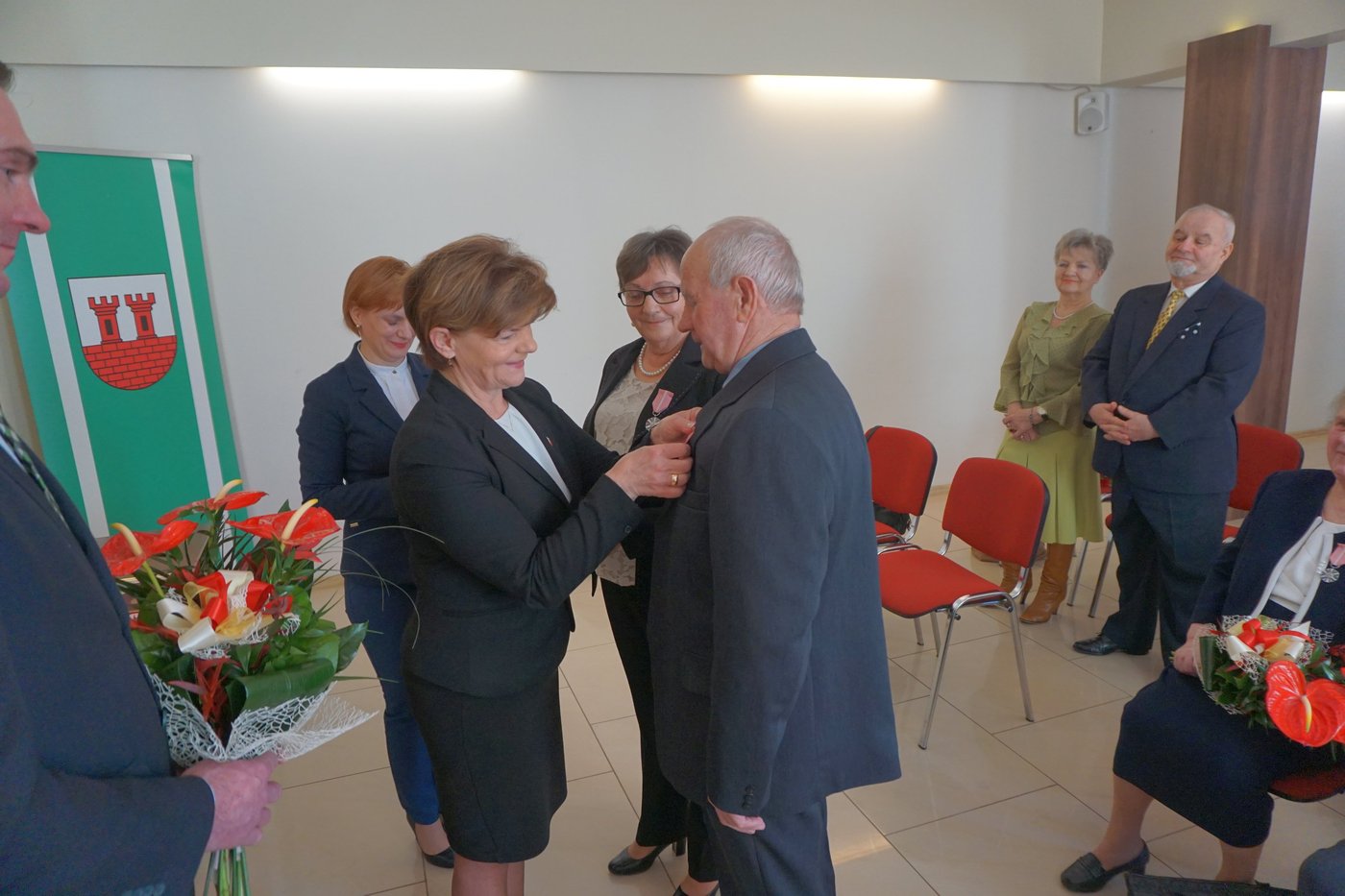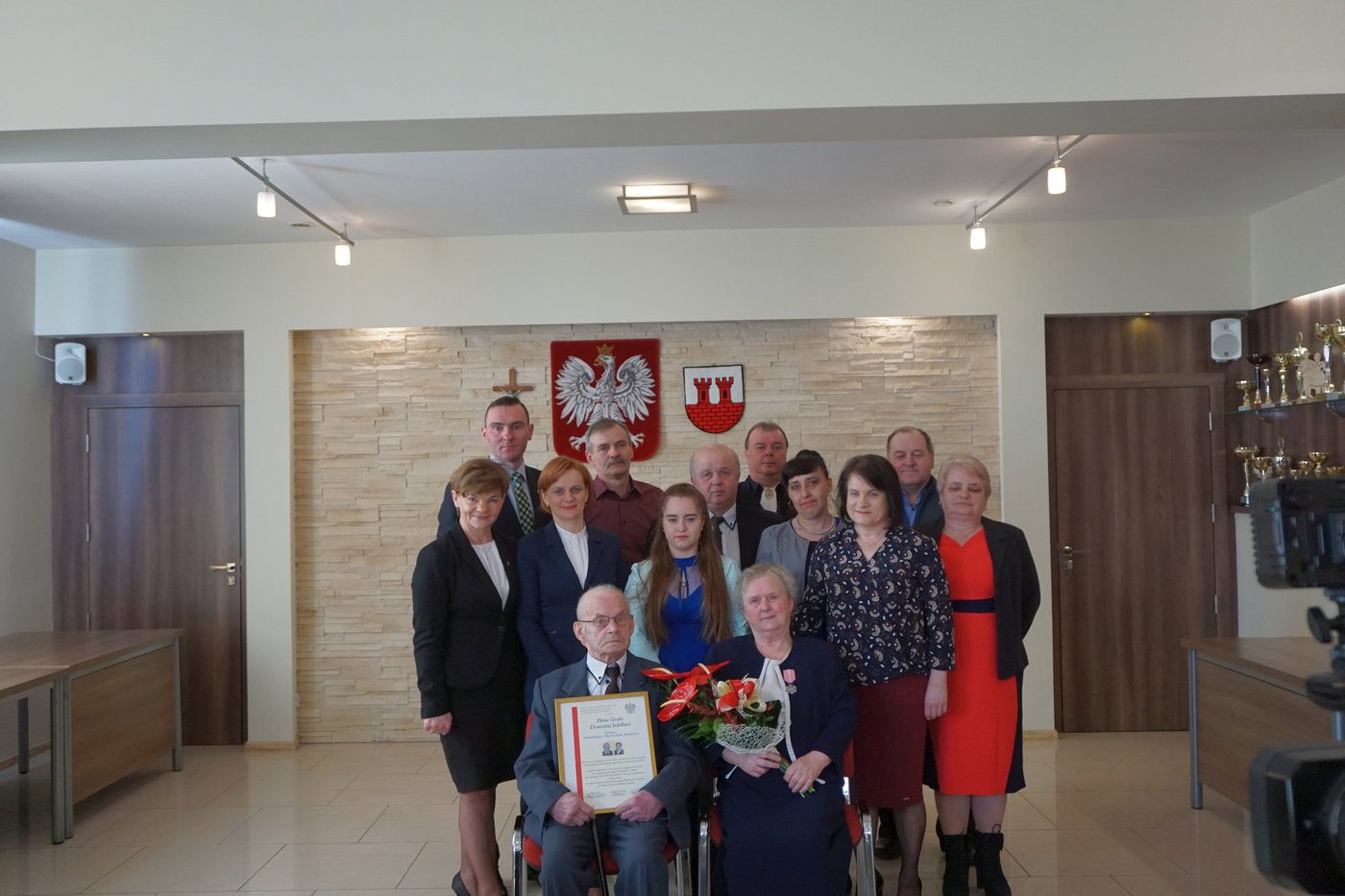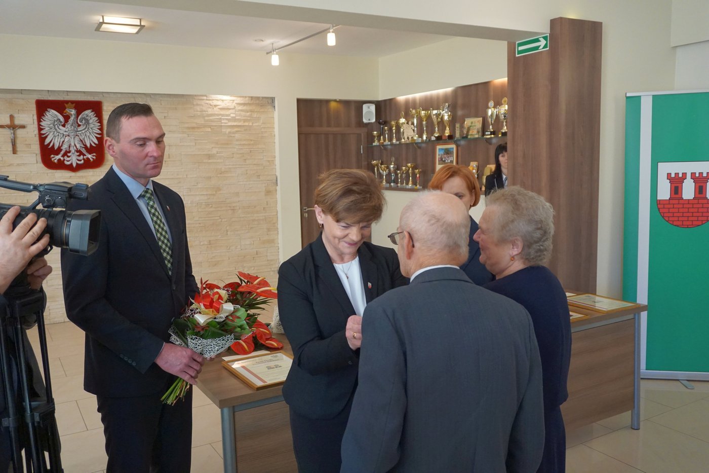 Bohaterowie uroczystości nie kryli wzruszenia i zaskoczenia, kiedy z rąk Wójta Gminy Pani Bożeny Dominiak otrzymywali nie tylko Medale za Długoletnie Pożycie Małżeńskie, ale też specjalnie wydrukowany na tę okazję oryginalny akt małżeństwa oraz pamiątkowy dyplom z życzeniami z okazji jubileuszu, zawierający zdjęcia małżonków. Dzięki temu mogli przypomnieć sobie pierwsze chwile swego związku.
