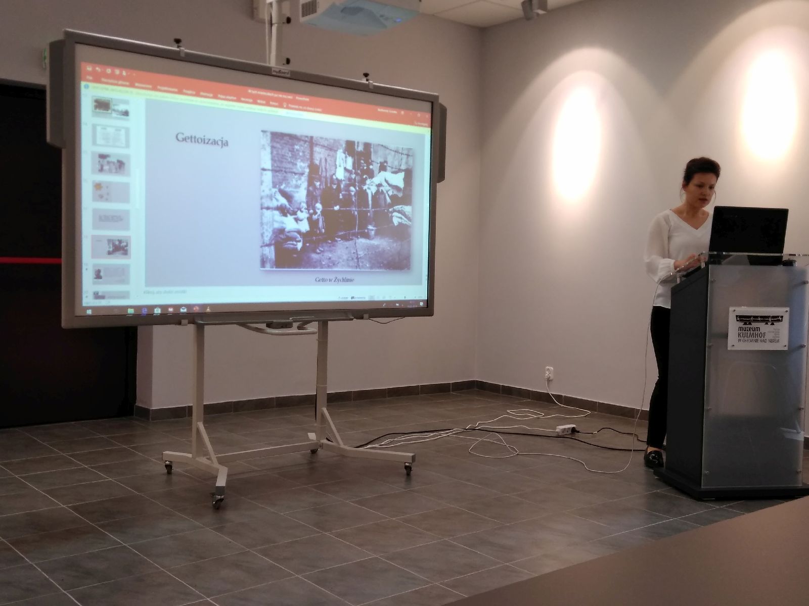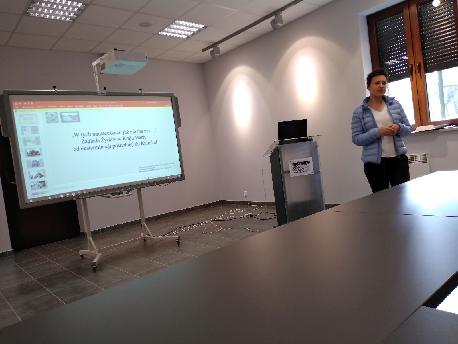 Wycieczkę rozpoczęliśmy od prezentacji multimedialnej przygotowanej przez pracownika Muzeum byłego niemieckiego Obozu Zagłady Kulmhof w Chełmnie nad Nerem panią Magdalenę Babik, która przybliżyła uczestnikom wycieczki historię tego miejsca. Obejrzeliśmy również film z naocznym świadkiem tamtych wydarzeń, który był wtedy dzieckiem.