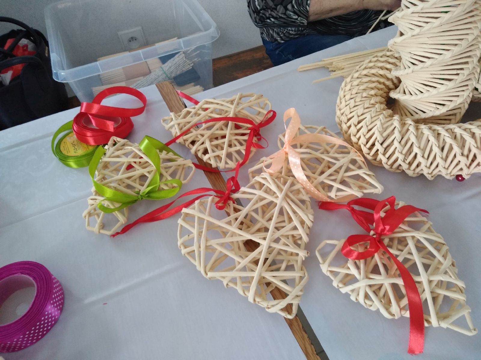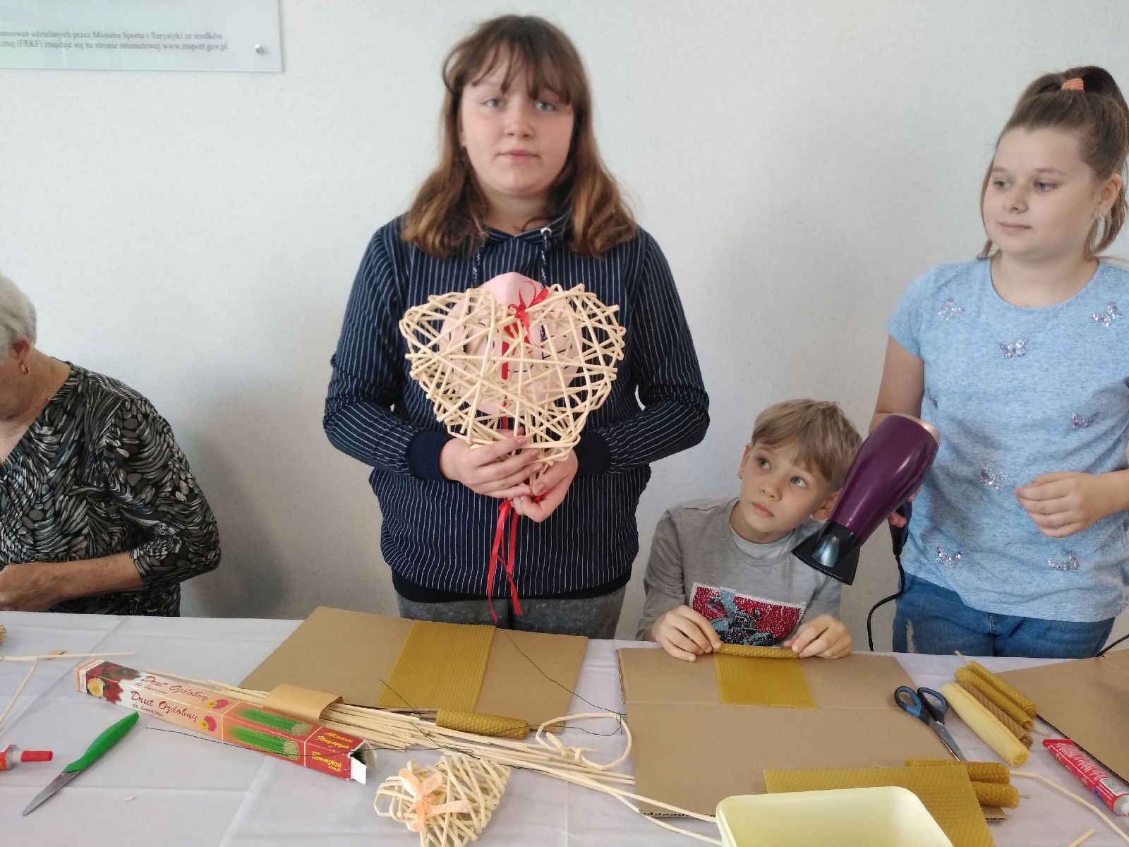 W trakcie warsztatów uczestnicy samodzielnie z skręconych papierowych rurek – tz.. tutek , plotły serduszka. Dzieci z zapałem podeszły do zadania. Pierwsze próby zrobienia serduszka z wikliny papierowej wychodziły nieco koślawo, ale tylko ćwiczenie czyni mistrza, więc już druga próba dała pożądany rezultat. I na naszych oczach powstały przepiękne serduszka z wikliny papierowej.