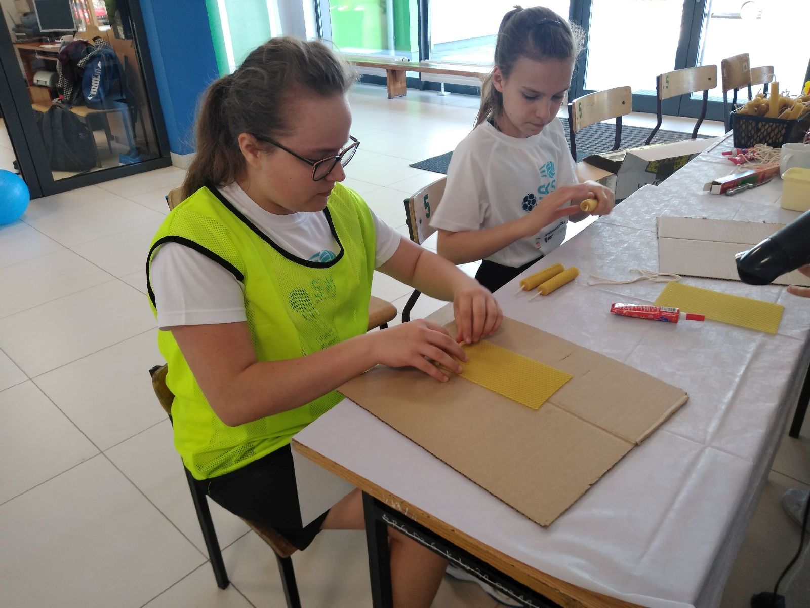 Każdy z uczestników warsztatów otrzymał zestaw do robienia świec : plaster węzy pszczelarskiej oraz knot bawełniany. Gdy już wszystko mieliśmy, zabraliśmy się do pracy i zaczęliśmy zwijać świecę. Plaster z węzy pszczelarskiej delikatnie podgrzaliśmy i całą dłonią zaczęliśmy zwijać świece. I tak świece były już gotowe . A na korytarzu Hali Sportowej w Grzegorzewie czuć było piękny zapach unoszącego się naturalnego wosku pszczelego.