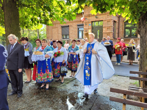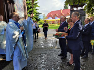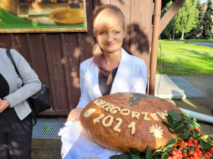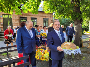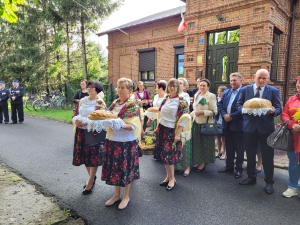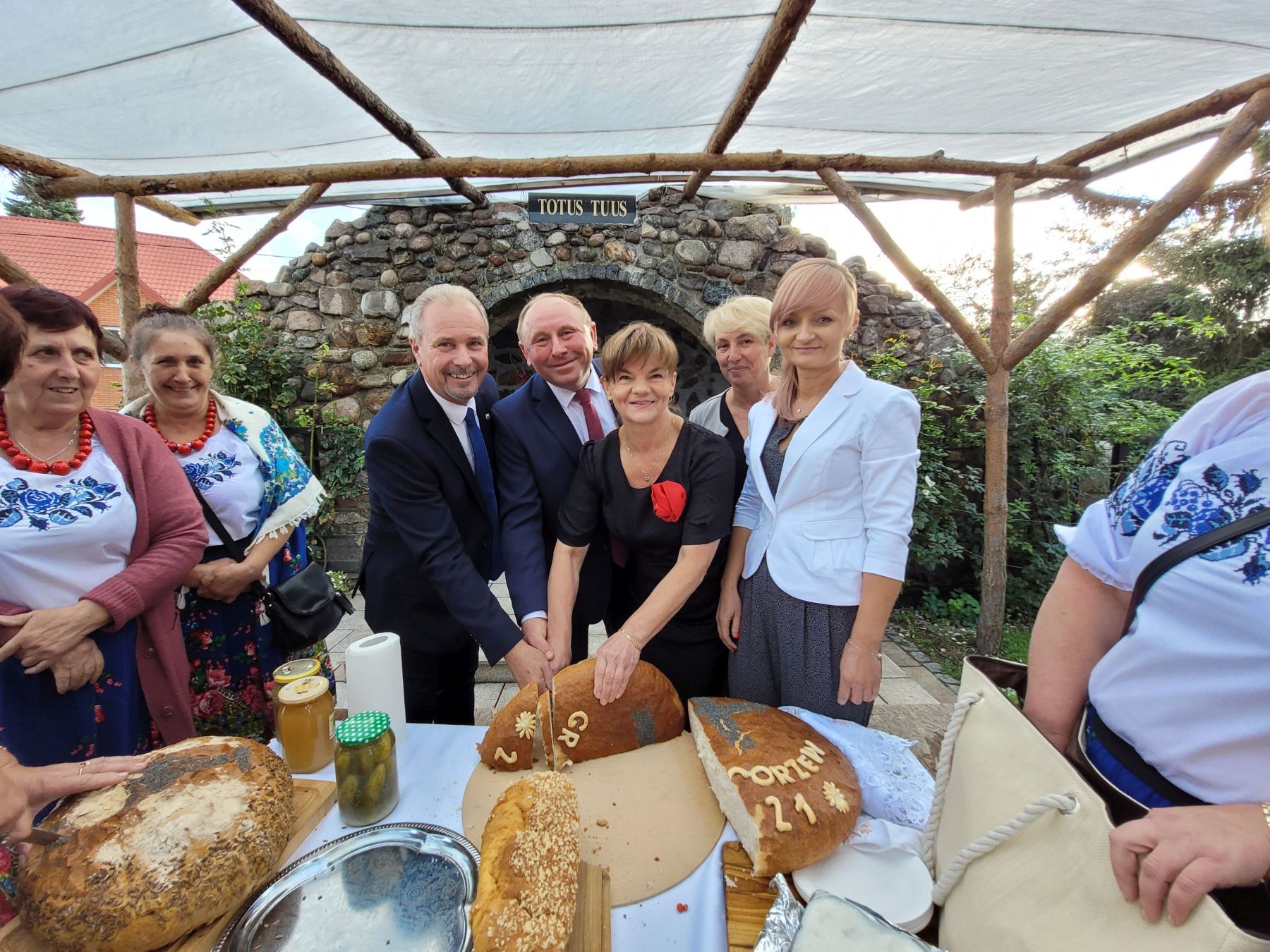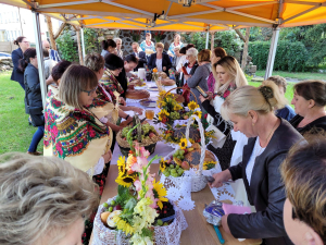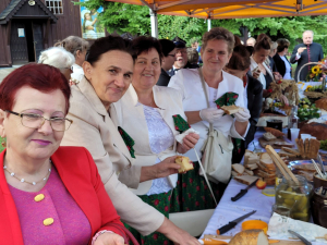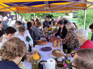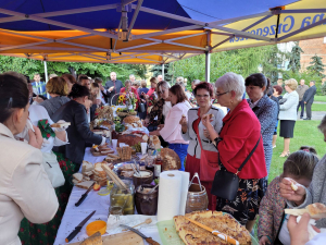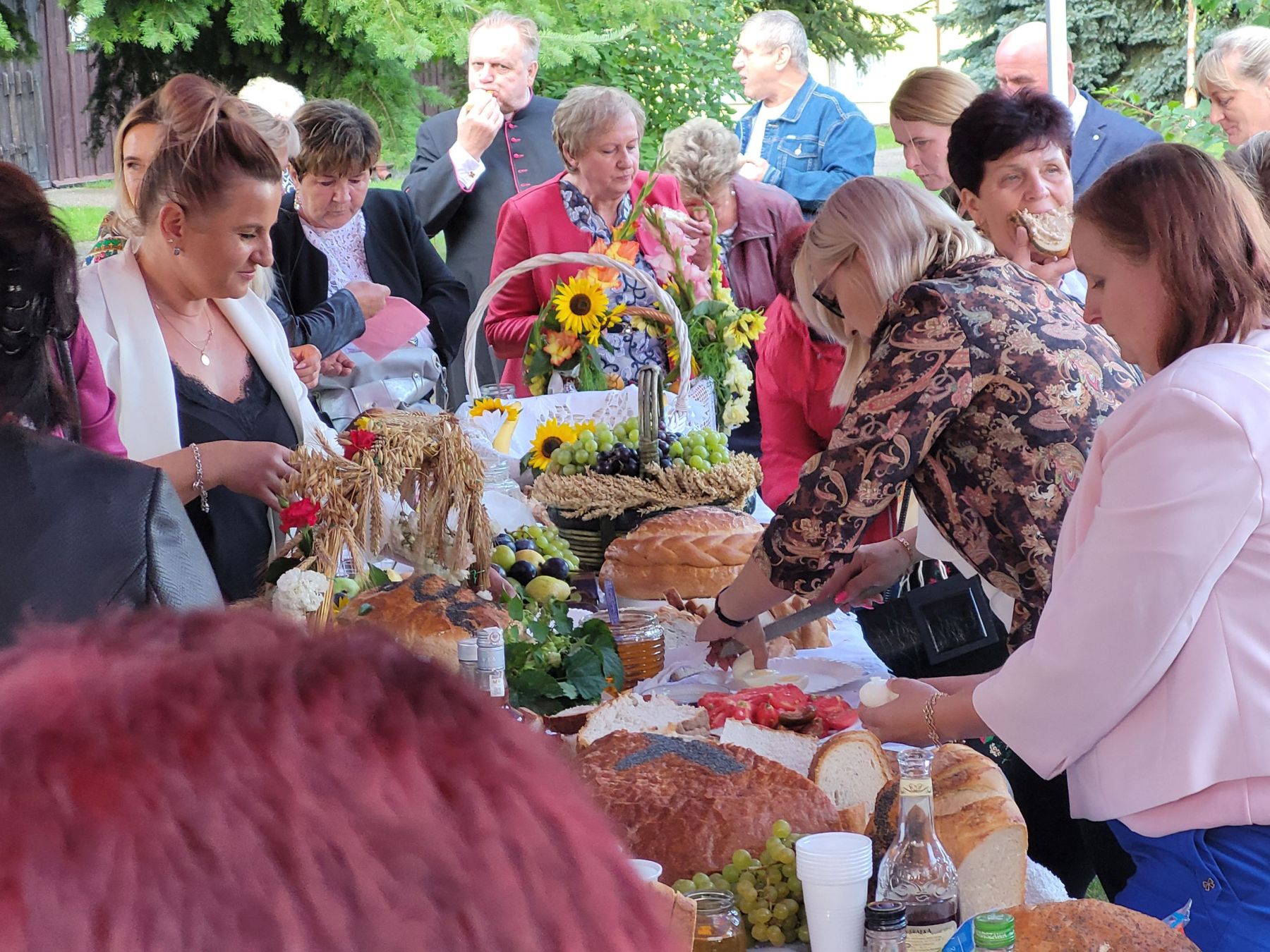 Na zakończenie uroczystości na placu przy kościele nastąpiło tradycyjne dzielenie się chlebem i darami. Każdy uczestnik mógł skosztować specjałów przygotowanych przez parafian.