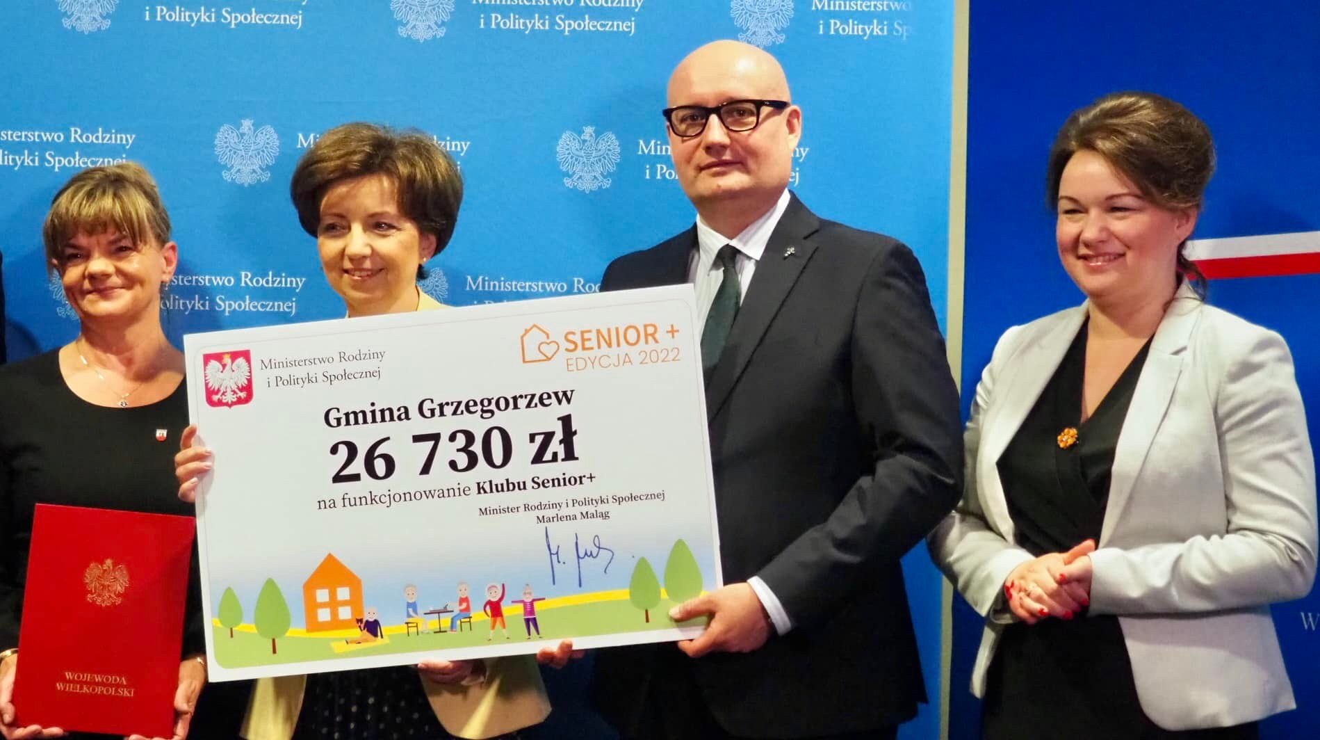 Obecne na spotkaniu Wójt Gminy Grzegorzew Bożena Dominiak oraz Skarbnik Renata Dopierała odebrały z rąk Ministra Rodziny i Polityki Społecznej Marleny Maląg, Ministra Zbigniewa Hoffmanna oraz Wojewody Wielkopolskiego Michała Zielińskiego symboliczny czek z dofinansowaniem w w/w kwocie.