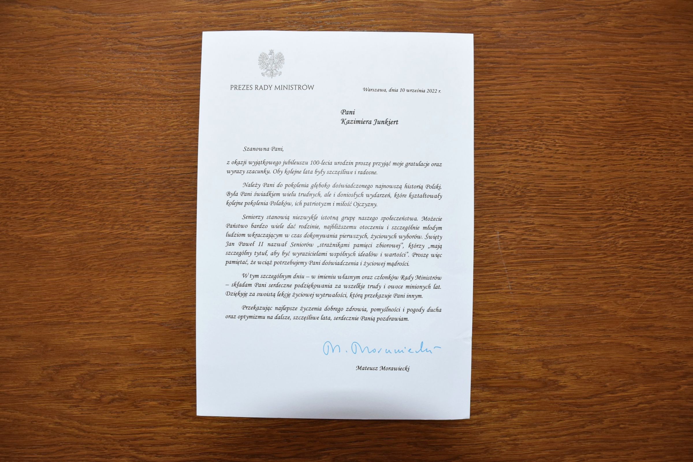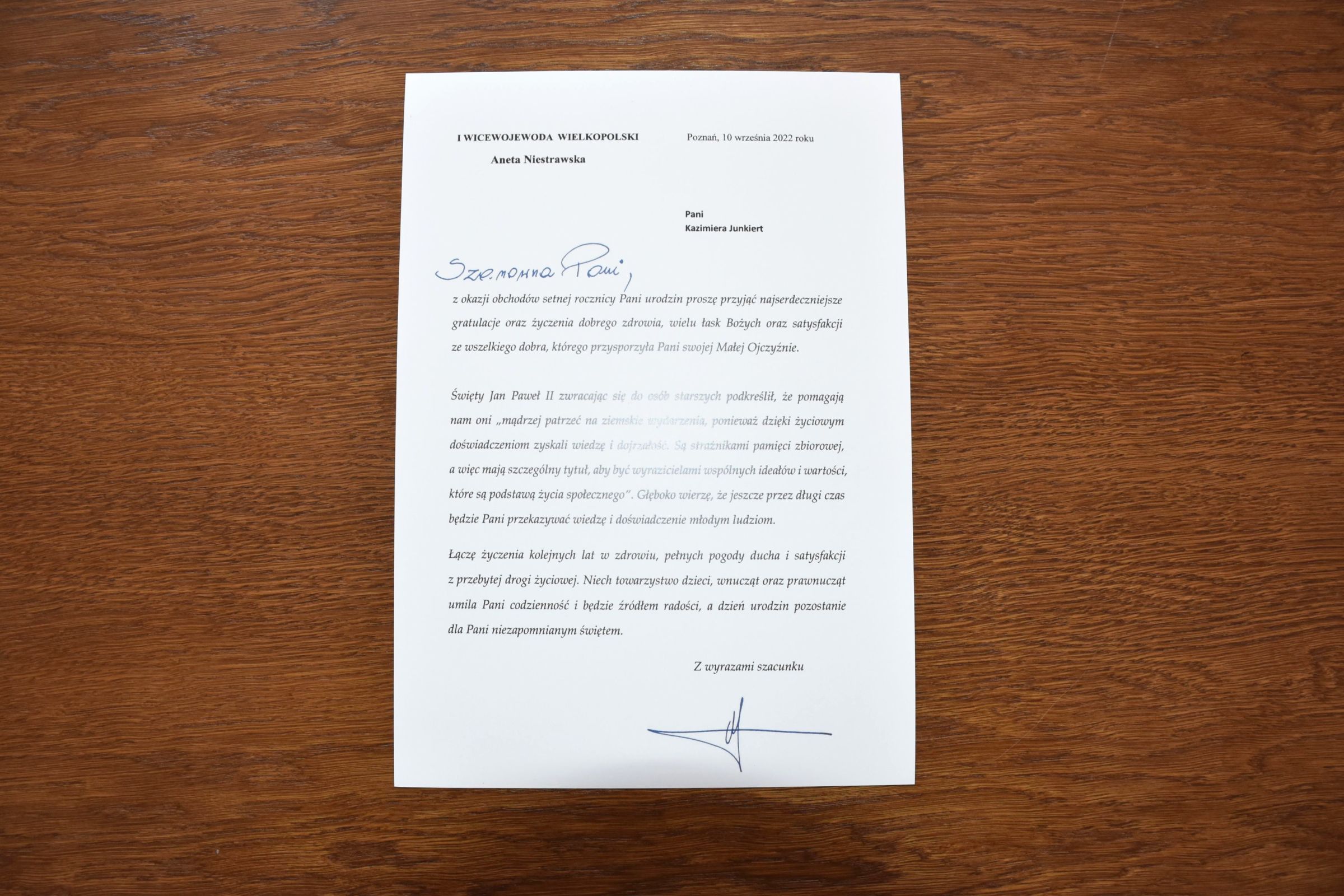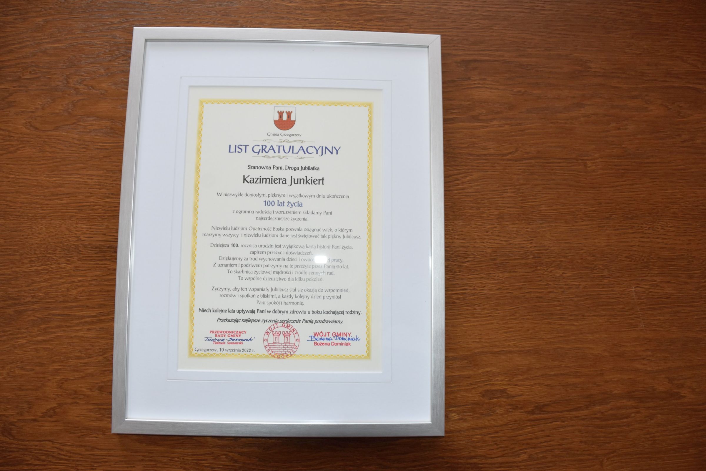 Pani Kazimiera otrzymała listy gratulacyjne od Prezesa Rady Ministrów Premiera Pana Mateusza Morawieckiego a także od I Wicewojewody Wielkopolskiego Pani Anety Niestrawskiej.