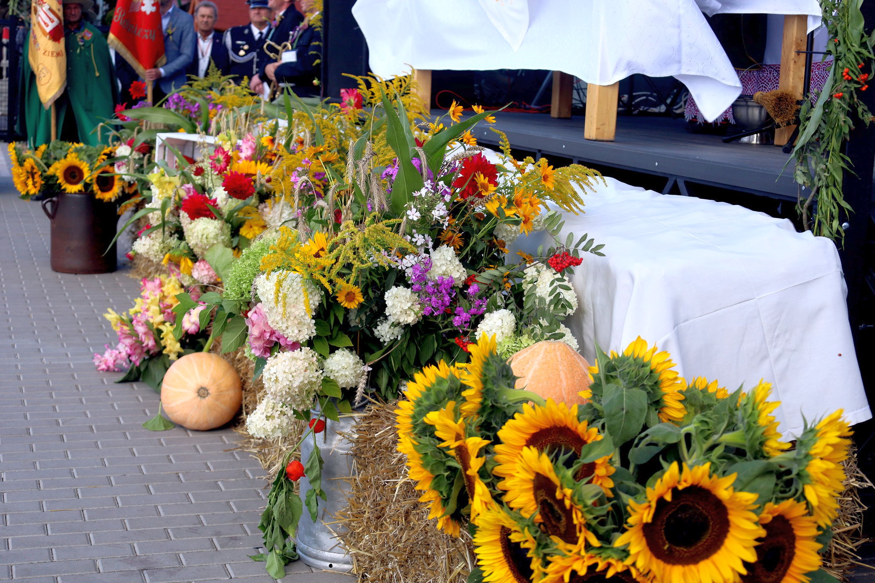 Wieńce dożynkowe, zgodnie z tradycją, były misternie zdobione, wypełnione zbożami, jarzębiną, kwiatami i kolorowymi wstążkami, co miało symbolizować urodzaj oraz dziękczynienie za obfitość ziemi.