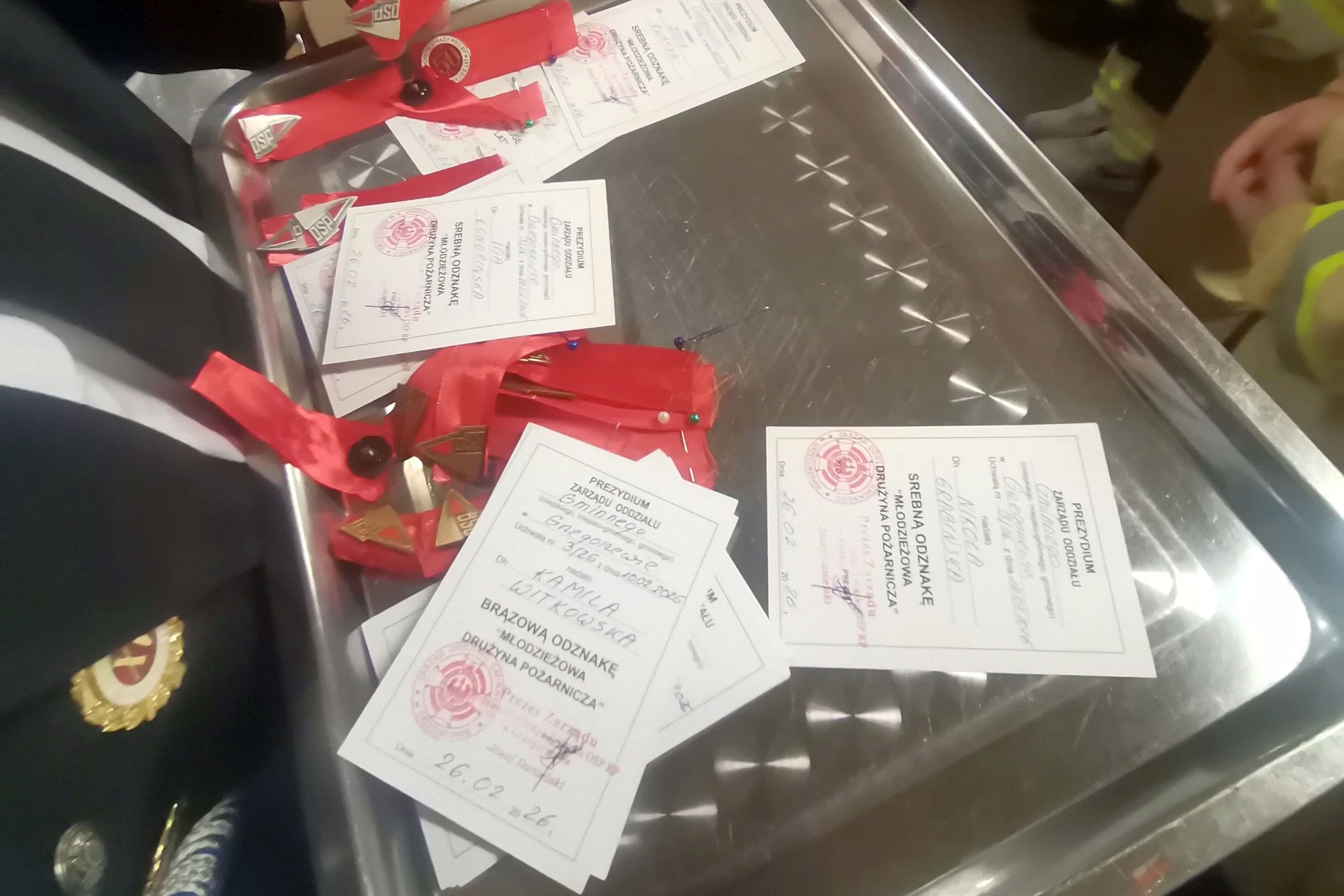 W trakcie zebrania wręczono srebrne i brązowe odznaczenia dla członków Młodzieżowych Drużyn Pożarniczych za zaangażowanie i służbę.