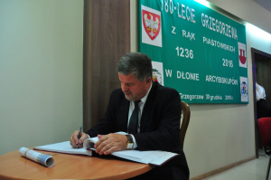 Wyrażając wraz z Przewodniczącym Rady Gminy Waldemarem Banasiakiem wdzięczność Księdzu Biskupowi za jego obecność wśród wspólnoty parafialnej i samorządowej w tak ważnym dla niej dniu, Pani Wójt Bożena Dominiak powiedziała, że uroczystość Świętej Rodziny z jednej strony wskazuje potrzebę, konieczność i zadanie troski o nasze własne rodziny, a z drugiej strony wspólnota jaką jest nasza gmina jest przecież także rodziną rodzin. Podkreśliła, że dzieje Grzegorzewa, tak jak i dzieje Polski od samego początku związane są z chrześcijaństwem. Stąd same nasuwają się na myśl takie wartości jak – pamięć, tożsamość i historia. Wezwała, by one nas jednoczyły jako wspólnotę, ponieważ stajemy się zjednoczeni, gdy utożsamiamy się z miejscem, w którym żyjemy i pracujemy będąc gotowi wzajemnie sobie pomagać. Również Pan Poseł Leszek Galemba podziękował Pasterzowi Diecezji za odprawioną Eucharystię i wygłoszone słowo Boże zwracając uwagę na to, że symboliczne znaczenie i jednocześnie przesłanie płynie dla nas z tego, że kończąc rok 1050-lecia Chrztu Polski spotykamy się, by przypomnieć sobie o znaczeniu w naszym życiu rodziny, bez której nie mielibyśmy przyszłości ani my sami, ani nasz naród, ani jakakolwiek wspólnota – większa czy mniejsza.