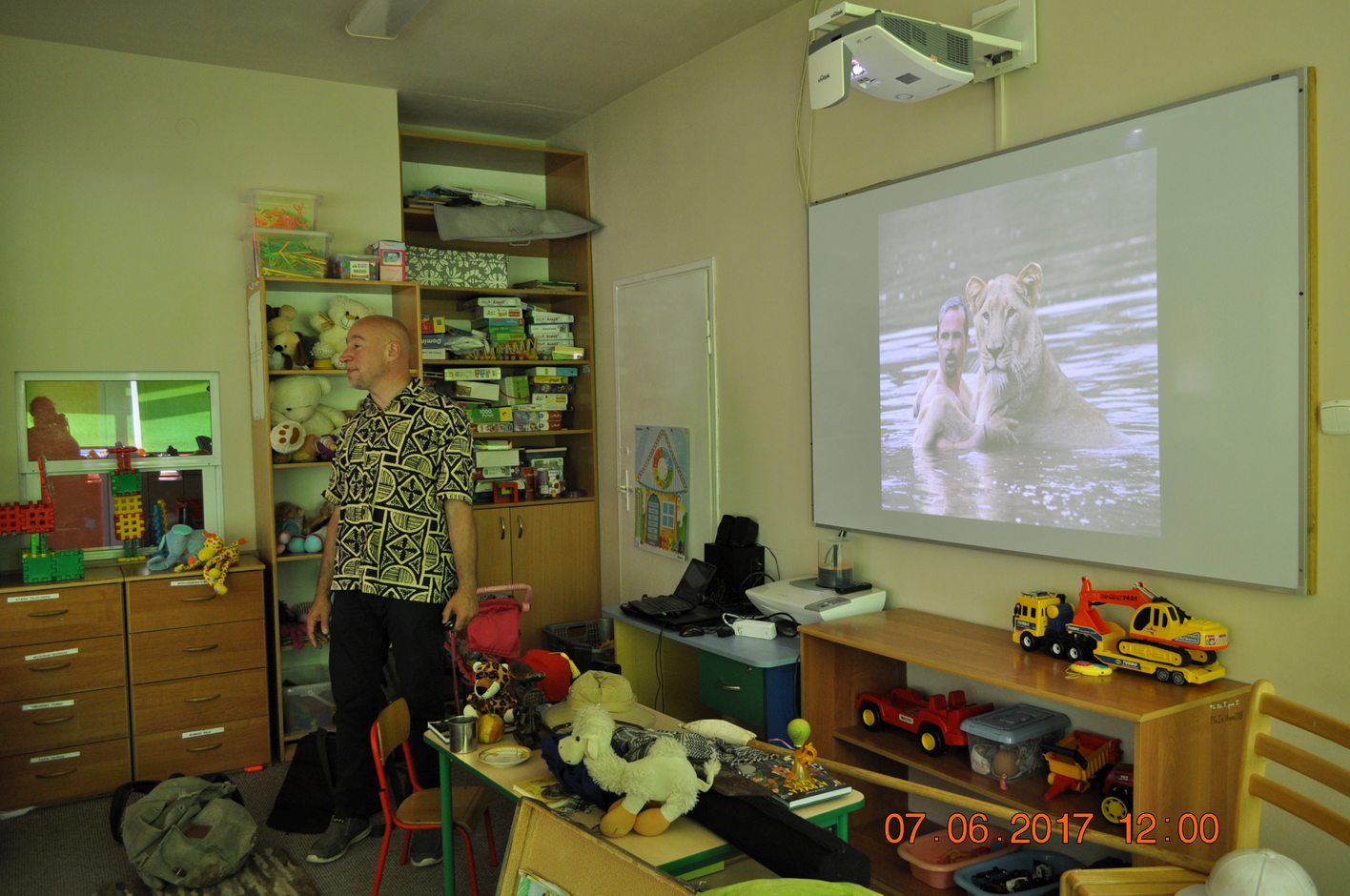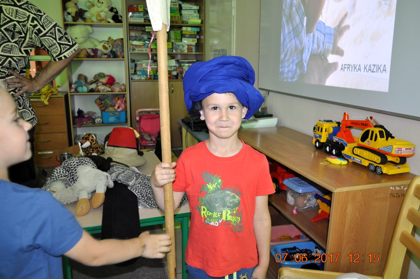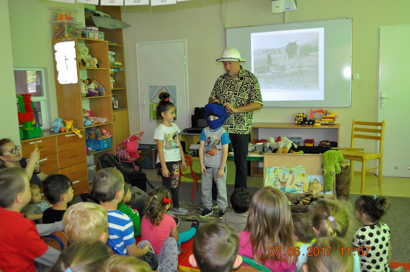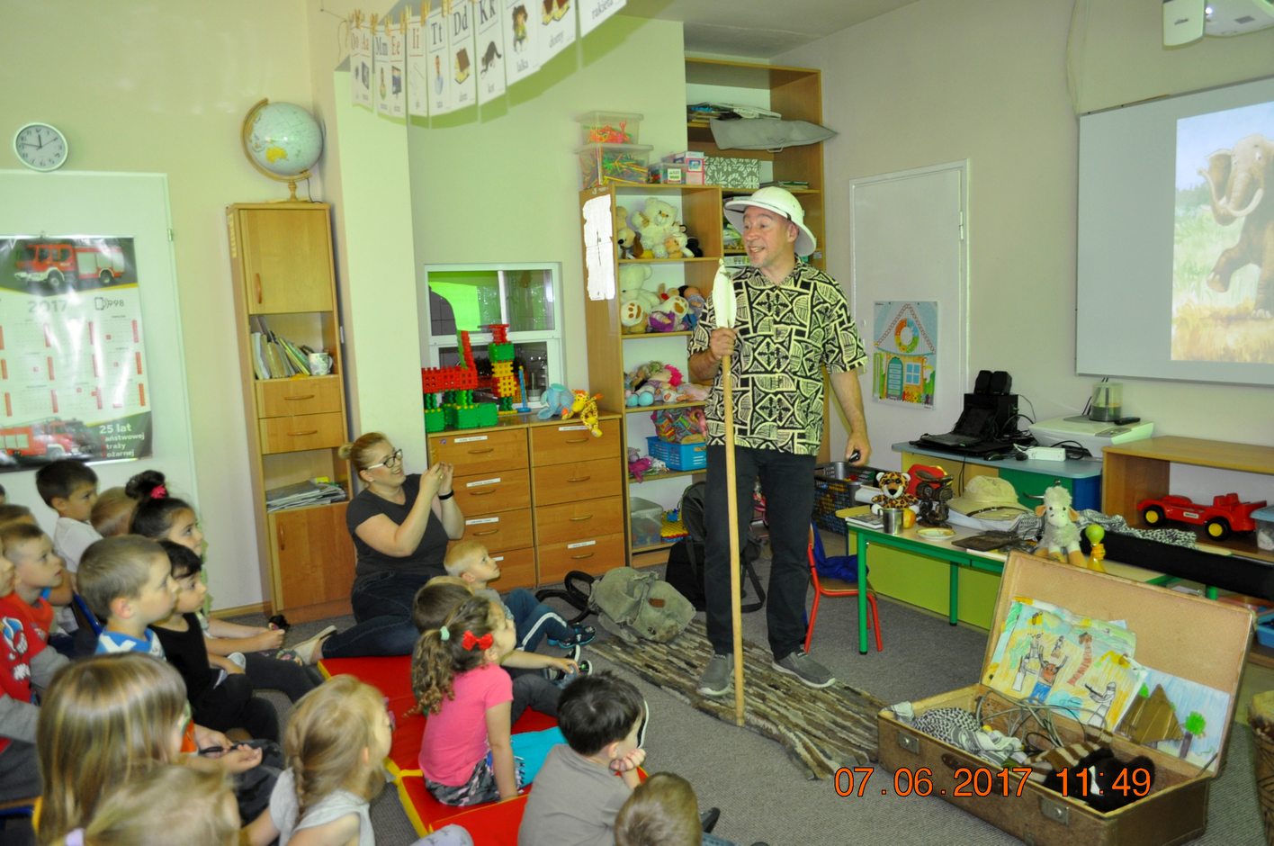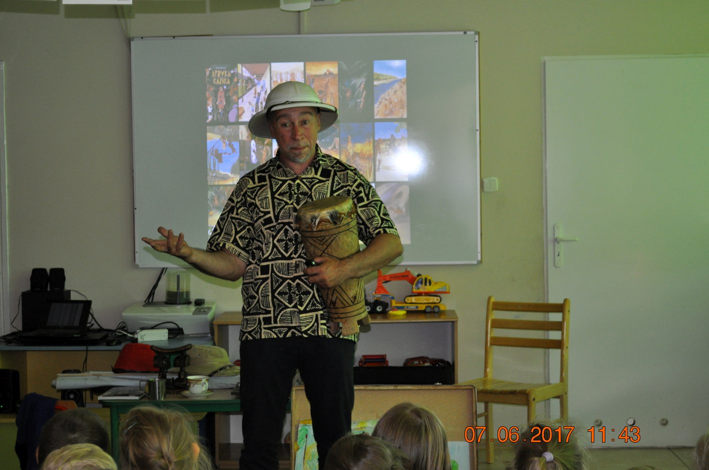 Autor przedstawił prezentacje multimedialną, dzięki której dzieci mogły zobaczyć i usłyszeć dźwięki jakie wydają i jak się zachowują afrykańskie zwierzęta. Następnie autor opowiadał dzieciom jakie spotkały go niebezpieczne przygody, spotkania z egzotyczną przyrodą i mieszkańcami. Każdy uczestnik spotkania miał okazję przymierzyć afrykański turban, zagrać na prawdziwym afrykańskim bębnie oraz położyć się na poduszce zrobionej z drewna.