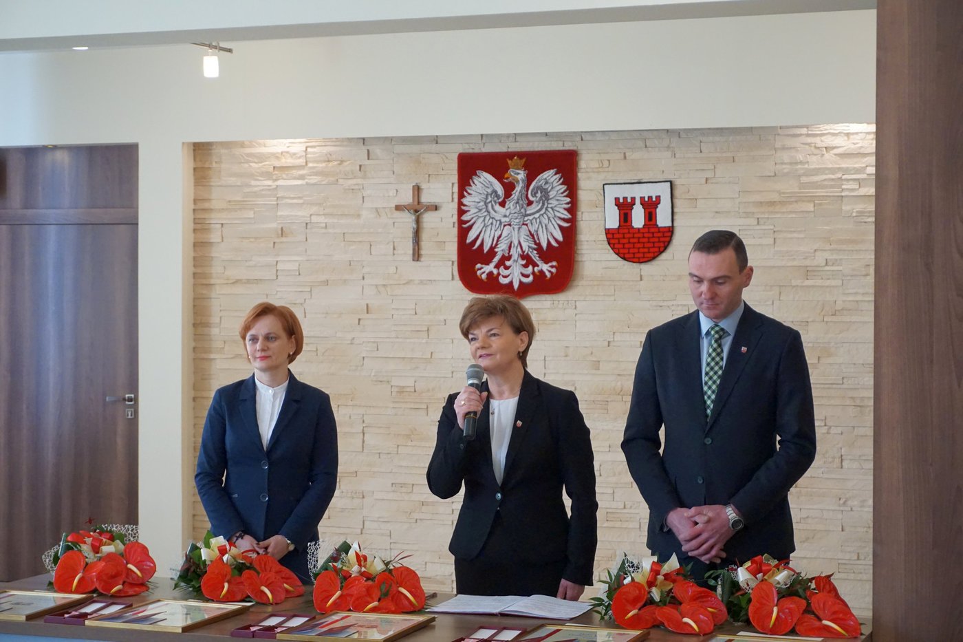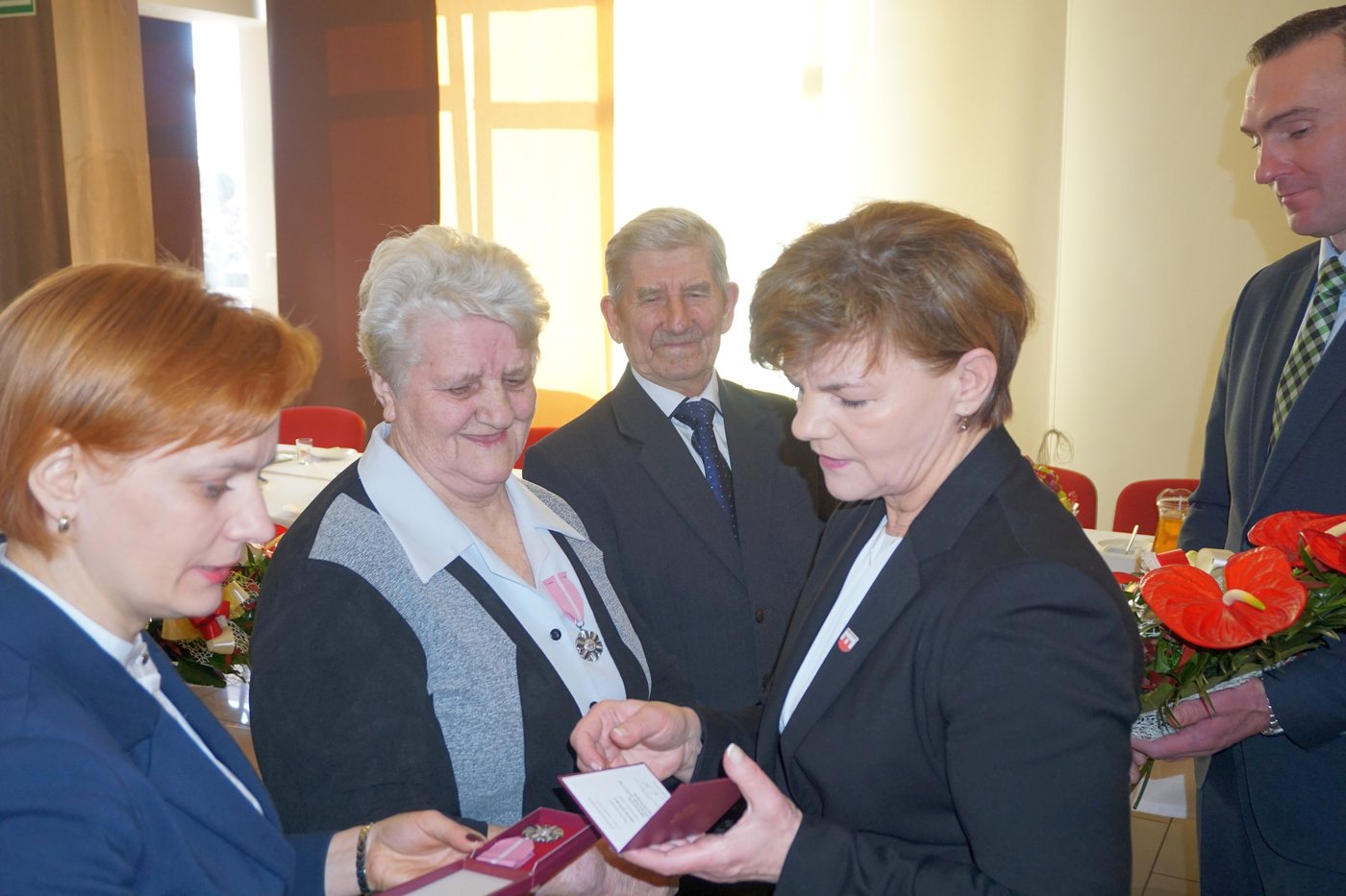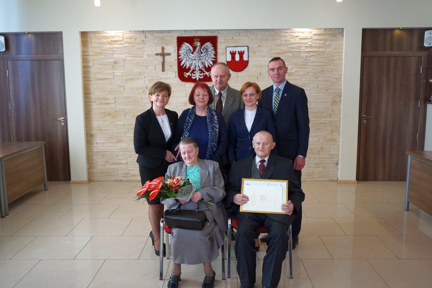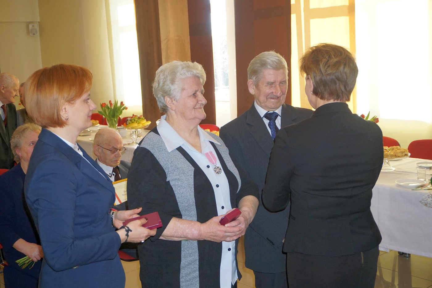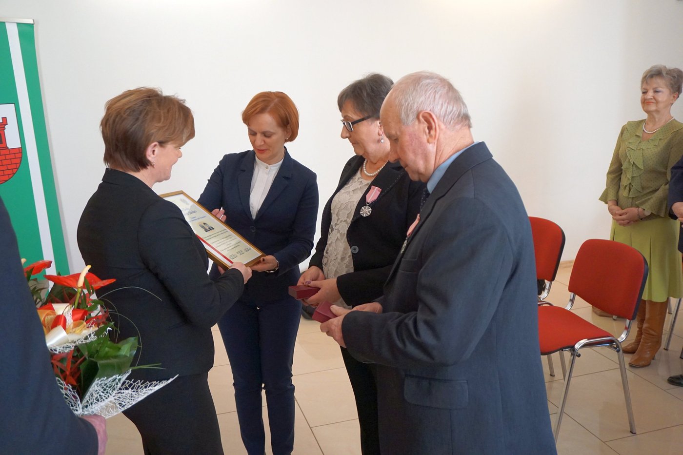 Bohaterowie uroczystości nie kryli wzruszenia i zaskoczenia, kiedy z rąk Wójta Gminy Pani Bożeny Dominiak otrzymywali nie tylko Medale za Długoletnie Pożycie Małżeńskie, ale też specjalnie wydrukowany na tę okazję oryginalny akt małżeństwa oraz pamiątkowy dyplom z życzeniami z okazji jubileuszu, zawierający zdjęcia małżonków. Dzięki temu mogli przypomnieć sobie pierwsze chwile swego związku.