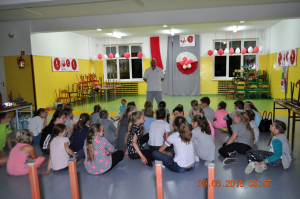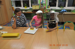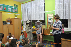 Po wyczerpujących bojach przyszedł czas na kolację dla małych burczących brzuszków. Pychotka - tak skomentowały dzieci. Po posiłku dzieci przystąpiły do dalszej części programu przewidzianego podczas Nocy Bibliotek. I dalej się bawiliśmy. Tym razem był to pokaz pszczelarski i warsztaty, które prowadziła pani Jadwiga Sosnowska i Małgorzata Ferenc. Zajęcia te miały na celu zapoznanie dzieci z życiem pszczół i ich ogromną rolą, jaką pełnią w środowisku naturalnym. Podczas warsztatów dzieci poznały pracę pszczelarza, dowiedziały się jak wybiera się miód z ula i do czego służą takie tajemnicze sprzęty jak podkurzacz czy podkarmiaczka. Dzieci poznały budowę tradycyjnego ula i dowiedziały się jak wygląda podział ról i organizacja życia w pszczelej rodzinie. Następnie dzieci wykonywały świece z węzy pszczelarskiej. Na koniec warsztatów czekała na dzieci słodka zdrowa niespodzianka – degustacja miodu oraz wyrobów pszczelarskich.