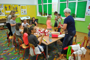 Odbyły się również warsztaty rękodzielnicze z bibuły, które poprowadziła pani Stefania Dorabiała, podczas których można było wykonać ręcznie robione kwiaty z bibuły. Dzieci wycinały, rolowały, skręcały i zwijały kwiatki.
