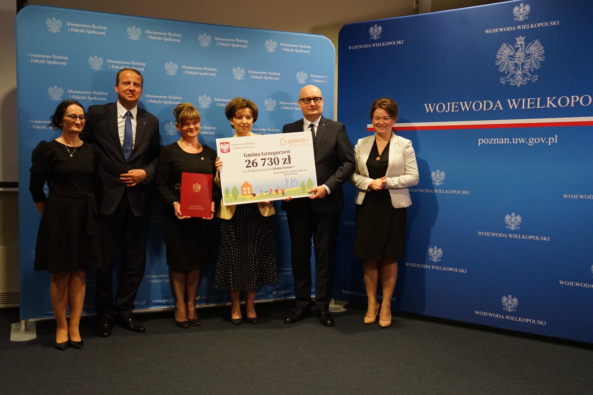 Obecne na spotkaniu Wójt Gminy Grzegorzew Bożena Dominiak oraz Skarbnik Renata Dopierała odebrały z rąk Ministra Rodziny i Polityki Społecznej Marleny Maląg, Ministra Zbigniewa Hoffmanna oraz Wojewody Wielkopolskiego Michała Zielińskiego symboliczny czek z dofinansowaniem w w/w kwocie.